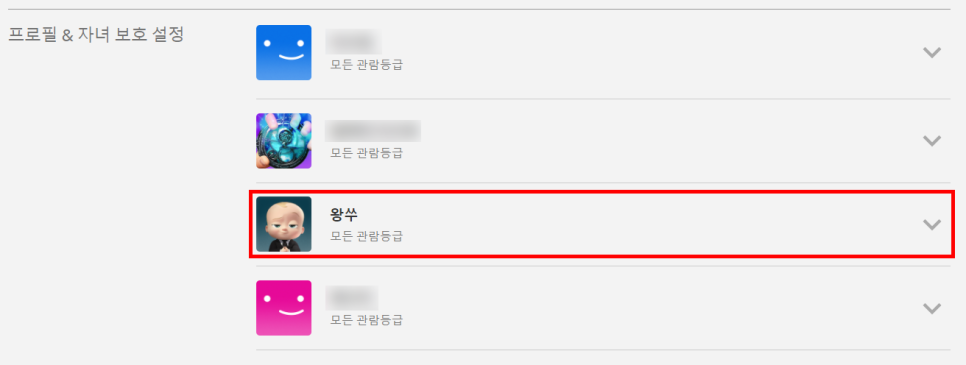 3. 아래로 내려가시면 프로필 & 어린이 보호설정이 나타나며 해당 위치에서 해당 계정을 클릭해 주세요.