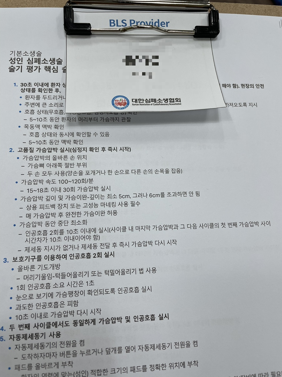 시험은 실습시험 2개 + 필기시험 1개로 구성되어 있으며, 실습시험은 성인 심폐소생술과 유아 심폐소생술입니다!교육 열심히 잘하시고 중간실습하면서 익힐꺼니까 걱정안하셔도 됩니다~