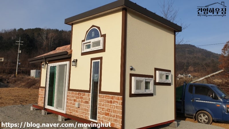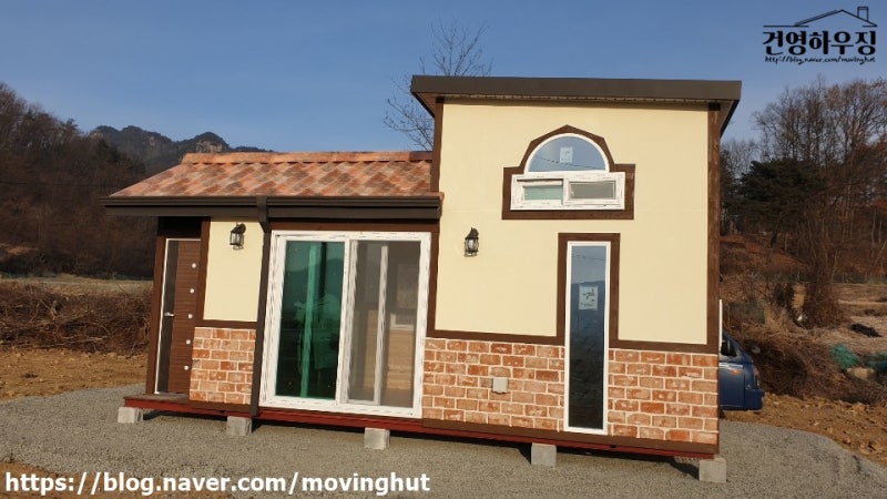 전면에 어닝을 설치하고 후면에 현관을 설치하였으며 심플하고 밝은 색상의 서모사이드를 사용하여 아기자기하고 깔끔한 농막이 완성되었습니다.