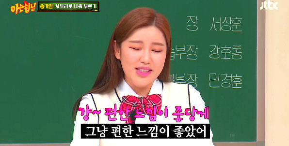 이어서 가수 송가인이 해외에서의 인기를 밝혔습니다 이날 강호동은 가인이 해외 팬도 그렇게 많다고 한다. 인기를 체감한 적이 있느냐고 묻자 송가인은 한창 방영해 화제가 됐을 때 재외동포들이 방송을 보고 그리워하면 메시지가 많이 왔다. 지나가면 외국 분들도 송가인 얘기도 해줬다고 전했다.