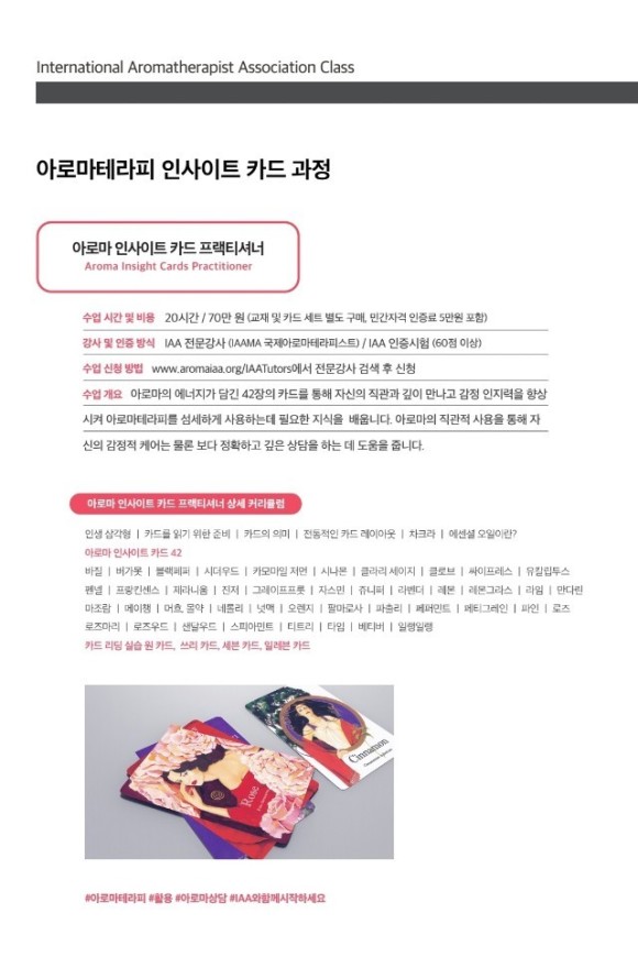 아로마 인사이트 카드는 (사)국제아로마테라피 전문가협회 전문강사만 교육이 가능합니다.아로마 인사이트 카드 공식 교육기관인지 꼭 확인 후 불이익을 당하지 않도록 신중히 확인 후 선택해주시기 바랍니다.