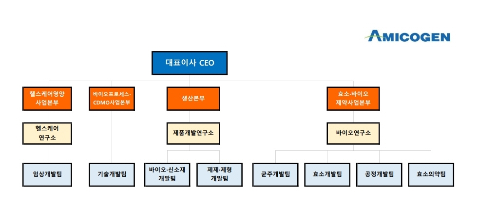연구 조직도(단위:명)구분 인원 구성 담당 업무 헬스 케어 영양 사업 본부 본부장 1-사업 본부 업무 총괄 연구소장 1-연구 센터 관리 및 R&D개발 담당 임상 개발 팀 4-건강 소재 개발 담당 생체 과정·CDMO사업 본부 본부장 1-연구소의 관리 및 R&D개발 담당 기술 개발 팀 14-단백질 레진 개발 담당 생산 본부 본부장 1-사업 본부 업무 총괄 제품 개발 연구소장 1-제품 개발 및 연구 업무 총괄 바이오 신소재 개발 팀 8-바이오, 신소재의 연구 개발 제재 제형 개발 팀 3-세제·제형 연구 개발 효소·바이오 제약 사업 본부 본부장 1-R&D총괄 연구소장 1-연구소의 관리 및 R&D개발 담당 균주의 개발 팀 6-미생물 대사 제어를 통한 대사 물질-대량 생산 기술 개발 담당(DX Pjt.)효소 개발 팀 6-특수 효소의 개발 담당 단백질 및 산업소용효소개발담당공정개발팀8-생산공정기술개발담당-발효기술담당효소의약팀3-의약용효소개발담당-엔돌신효소와생산균주게발합계59-