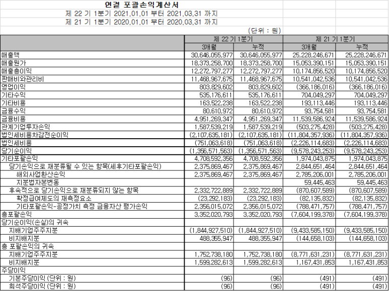 나. 연구개발비용(단위:천원) 구분 2021년 1분기(22기) 2020년도(20기) 2019년도(20기) 매출액 30,646,056115,856,069115,180,889 연구개발비용계 5,488,2227,807,5897,993,959 연구개발비/매출액비율 연구개발비 용계÷당기매출액×100] 17.91% 6.94%