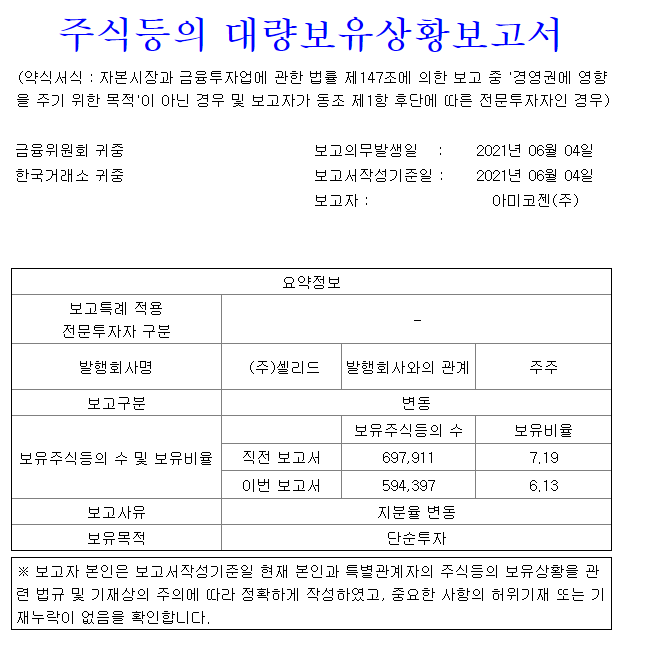 3)아미코젠과 셀리드, 그리고 크리노믹스 – 오늘 셀리드 주식을 팔았네. 셀리드 시가총액이 8천억원 정도 되고 오늘 판 지분이 1%니까 80억원 남짓 현금 확보.재테크인지 회사에 현금이 필요해서인지 2분기 실적이 나오면 알 것 같다. 크리노믹스 지분도 꾸준히 팔고 있다. 단순한 exit라기보다는 회사 자금을 조달하기 위한 조치인 것 같다
