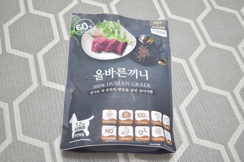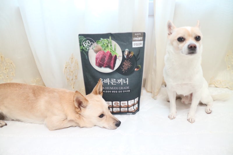 저희 강아지들은 원래 육식동물이었는데요.그래서 사료에는 꼭 신선한 고기가 듬뿍 들어 있는 걸 고르는 편입니다.올바른 식사 사료는 생육 함량을 60%로 늘려 육식 습성 강아지 입맛에 딱 맞도록 되어 있습니다.그 밖에 브로콜리, 아스파라거스, 호박 등 강아지 영양까지 다양하게 섭취할 수 있습니다.