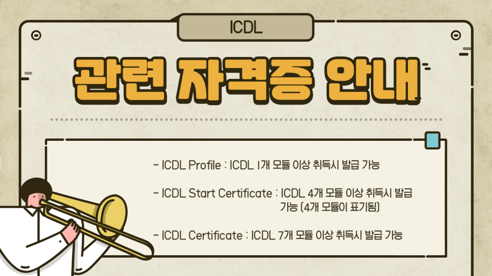 ICDL 자격증 관련 안내를 통해 PR OFILE은 1개 이상의 모듈을 취득하면 발급, 4개 이상의 모듈을 취득하면 START CERTIFICATE 발급, 7개 이상의 모듈 취득 시 CERTIFICATE 발급이 가능합니다.