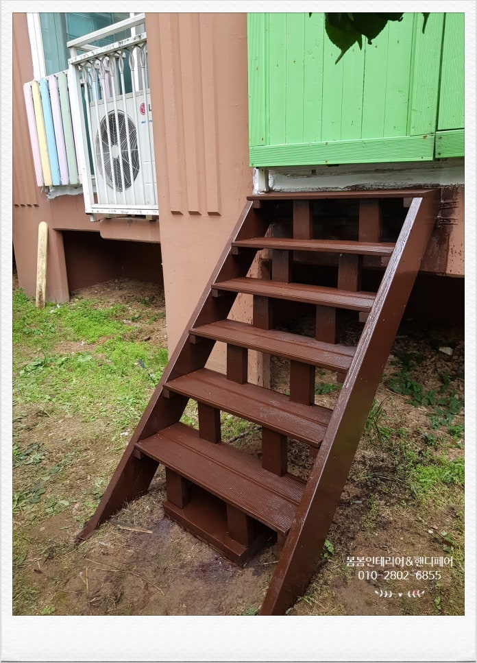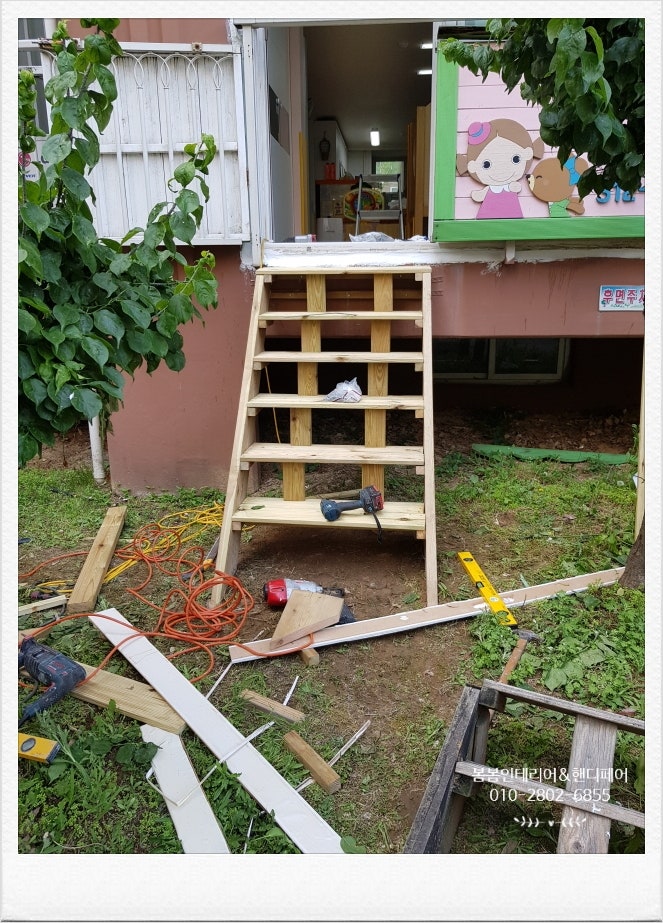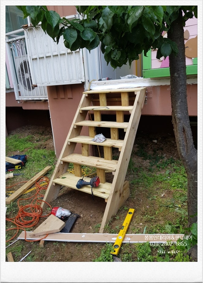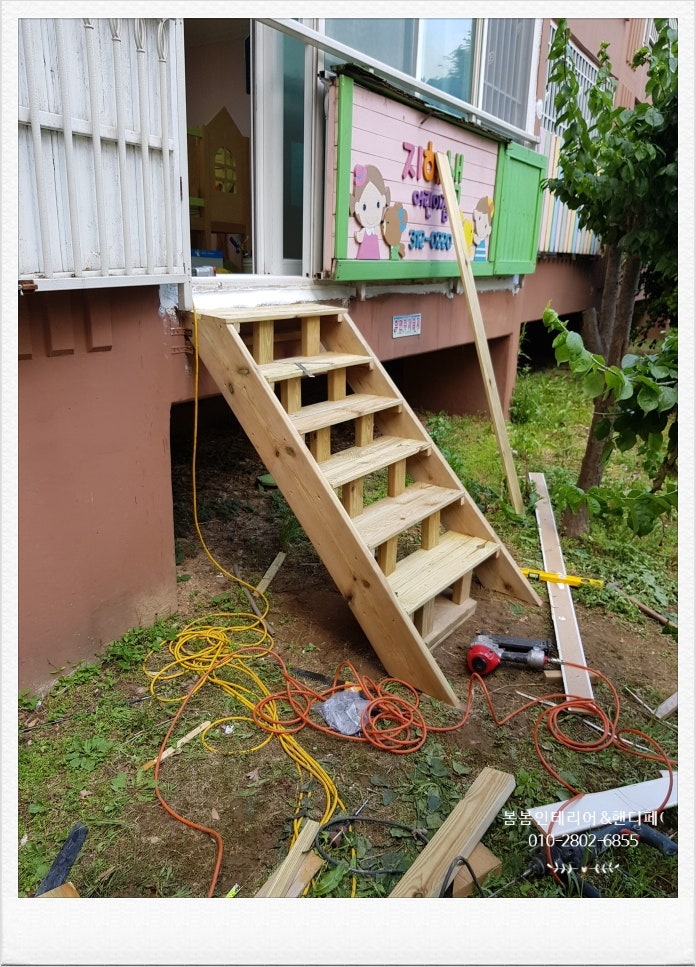어린이집 비상계단인데요.외부 방부목 비상계단이 낡고 부식되어 있어 새로 만들어야 한다고 원장님께서 의뢰하셨습니다.어린이집이라 원아들이 없는 시간에 진행해야 할 것 같았어요.그리고 우천 시에는 작업을 할 수 없기 때문에 시간도 잘 맞춰야 할 것 같아 지난 토요일에 비가 오기로 되어 있었는데 날씨가 좋아서 진행을 했습니다.