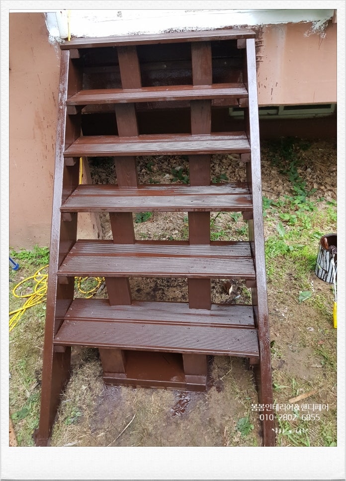 어린이집 비상계단을 다 만든 후 오일스테인을 발라줬어요. 한 5번 정도 바른 것 같네요.같이 가는 게 너무 많이 바르는 거 아닌가 싶을 정도로…흐흐흐 오래 사용해야해서요.. 도토리색으로 오일스테인을 발랐어요.