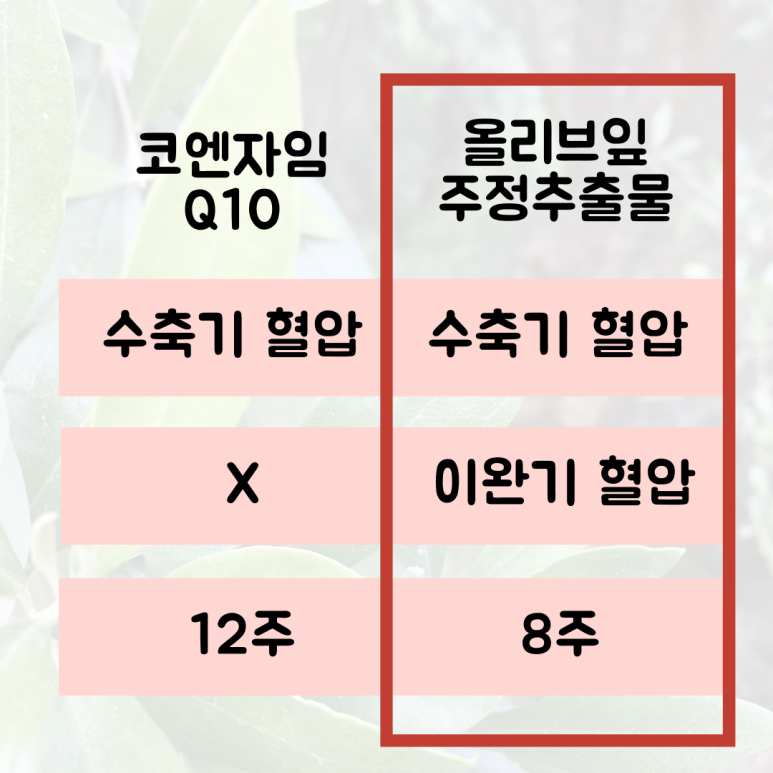 게다가 올리브 잎 주정추출물은 코엔자임 Q10보다 혈압 감소에 더 빠른 효과를 보인 것으로 나타났습니다. 코엔자인 Q10은 12주가 걸린 반면 올리브 잎의 주정 추출물은 불과 8주밖에 걸리지 않았습니다. 뿐만 아니라 올리브 잎의 주정 추출물은 친환경 식물성 유래 원료이기 때문에 고혈압에 좋은 영양제의 핵심 성분이라고 생각됩니다.