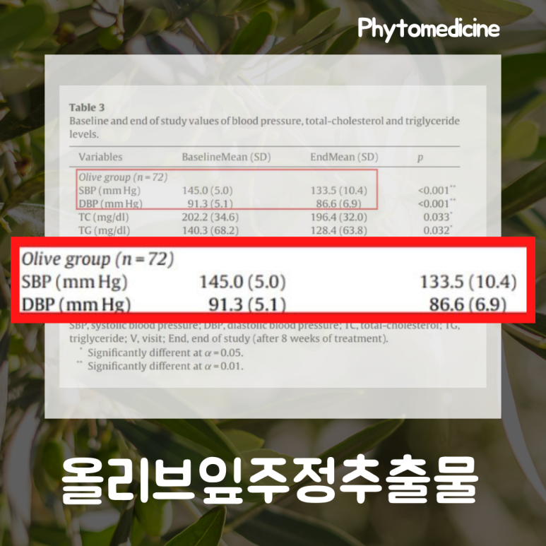 혈압이 높은 대상자에게 올리브 잎 주정 추출물을 8주간 꾸준히 섭취하게 한 결과 수축기와 이완기 혈압이 모두 유의미한 수준으로 감소했다는 연구결과가 해외 임상저널 phytotherapy Research에 게재된 바 있습니다.