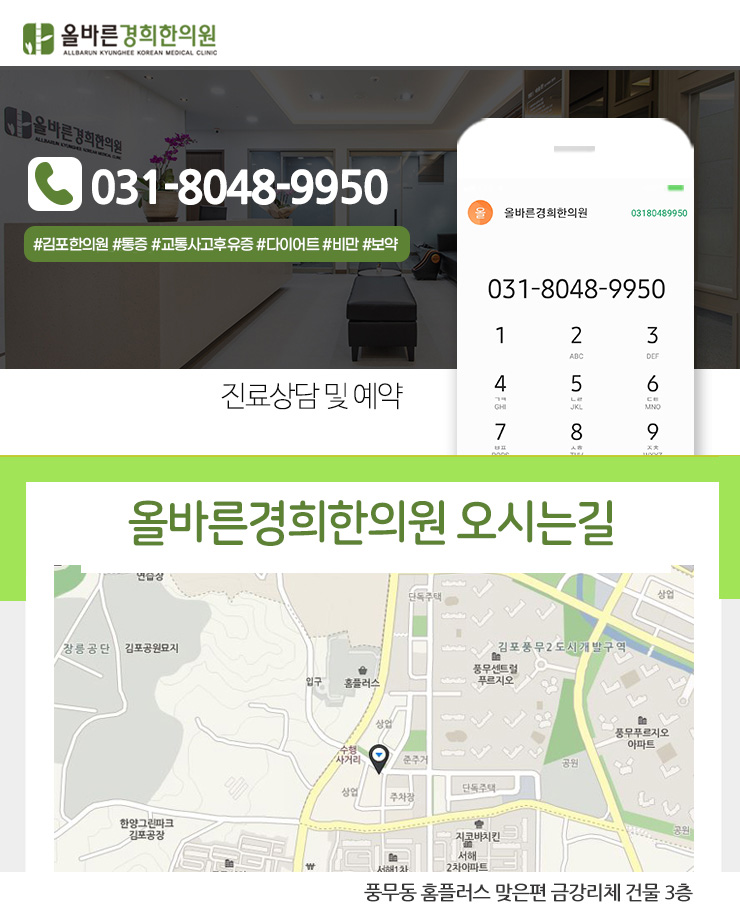 올바른 경희한의원에서는 환자에 대한 면밀한 진단, 그리고 이를 통해 풍무동 추나요법을 비롯한 다양한 한방관리를 통해 보다 건강한 변화가 이루어질 수 있도록 돕고 있습니다.