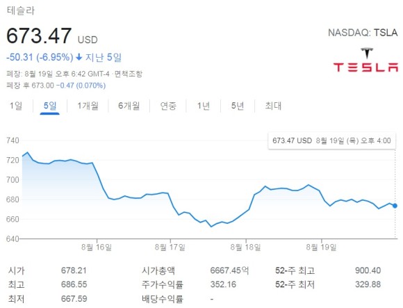 이날 NHTSA의 실사 착수 소식이 전해지면서 나스닥에서 테슬라의 주가는 급락했지만 16일(현지 시간) 기술주 중심의 나스닥은 전날보다 0.2% 하락한 가운데 테슬라는 4.32% 떨어진 686.17달러에 거래를 마쳐 677.35달러로 장을 마감한 올 7월 29일 이후 가장 낮은 종가 기록입니다.