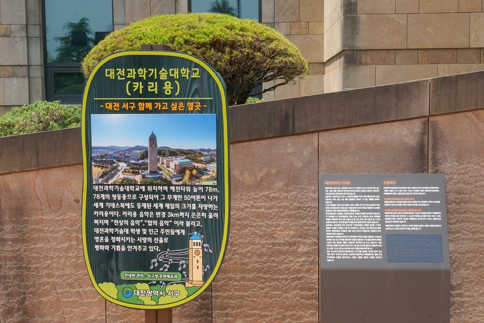 카리욘 연주로 자란 카리욘 주변의 나무들이 왠지 더 상큼해 보이네요. 대전의 랜드마크이자 세계기네스북이 대한민국 대전에서 그 무엇보다도 뜻깊게 느껴집니다.대전과학기술대학교 대전광역시 서구 혜천로 100 문의(042) 580-6114 대전광역시 서구 혜천로 100
