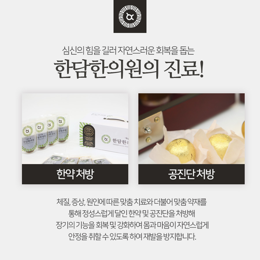 환자 개인의 차이를 고려해서 맞춤형 개선안을 제시하겠습니다.아무리 좋은 약재로 정성스럽게 조제된 한약 및 공진단이라 해도 환자 개개인의 상태에 맞게 조제되지 않으면 긍정적인 효과를 기대할 수 없습니다. 저희 병원은 그 점을 잘 알고 있기 때문에 같은 번아웃 증후군이라고 해서 모두 같은 약제를 처방하고 있지 않습니다. 환자의 체질, 건강상태, 현재의 증상, 심리적 스트레스, 원인 등에 따라 환자의 몸에 잘 맞는 한약재로 약을 조제하고 달입니다.