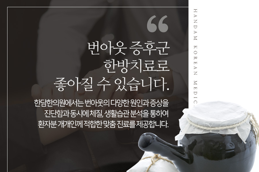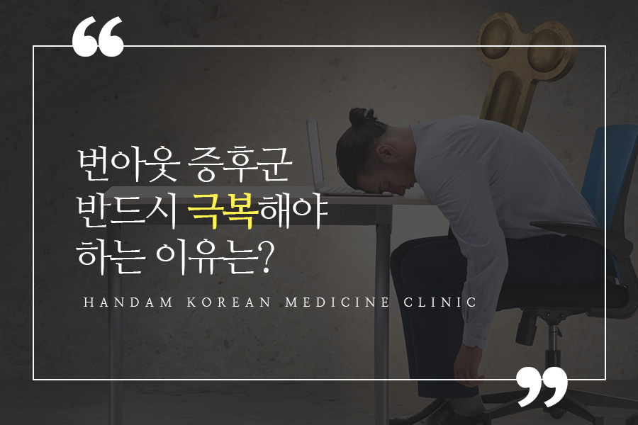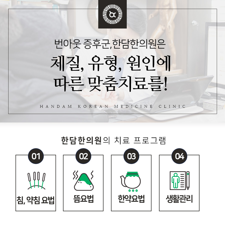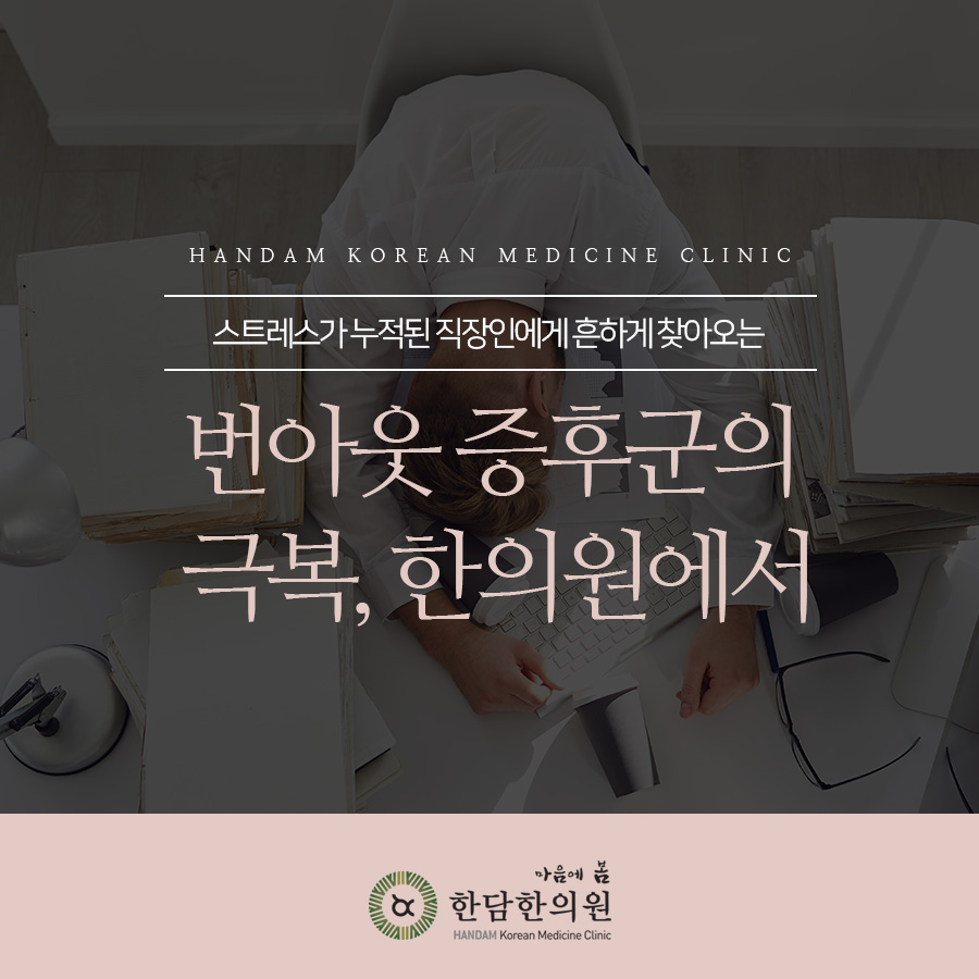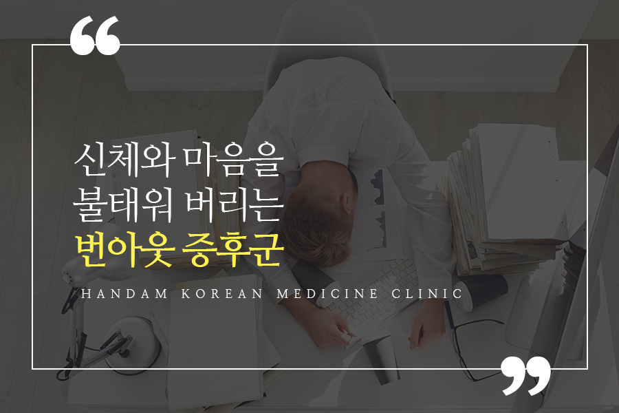 번아웃을 극복한 한방치료를 기대할 수 있습니다에너지가 모두 불탄 것처럼 재가 되어 버린 번아웃 증후군은 자동차 엔진에 비유하면 엔진이 과열되어 버린 상태를 말합니다. 이 경우 엔진이 과열된 원인을 개선해 주는 것이 정답입니다. 이를위한방법으로는앞서말씀드렸던휴식,도와주기,그리고취미활동이런여러가지방법들을생각할수있겠지만이러한노력으로도좋아지지않으면치료를고려할수있습니다.