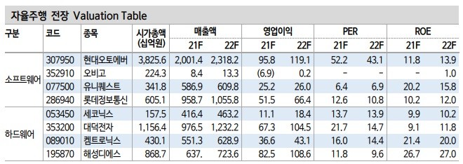 1. 소프트웨어 「Top Picks:」차량 전반의 SW를 공급하는 현대 오토에버, 커넥티드 카의 SW 공급 회사 「오비고」가 있다. 인프라 및 시범운행 중인 롯데정보통신, ADAS 기반 모니터링 사업을 수행하고 있는 유니퀘스트를 투자유망주로 제시한다.