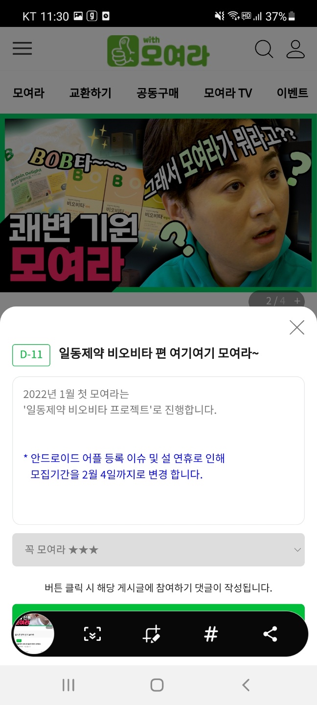 ‘위드 모여’ 앱으로 ‘일동제약 비오비타’ 참여합니다.버튼을 누른 사람 수에 따라 혜택이 점점 커진다고 하기 때문에 누르지 않을 수 없습니다.