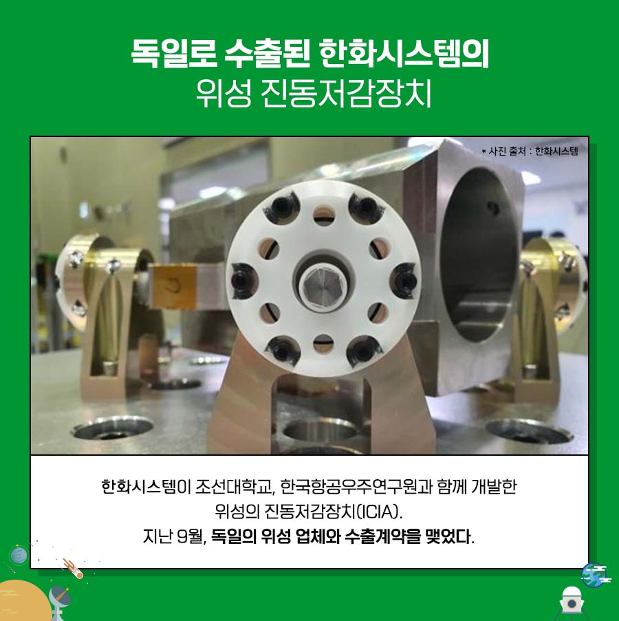인공위성에는 현재 능동형, 수동형 두 가지 기술이 사용되고 있습니다. 능동형 진동 저감 기술은 진동을 확실하게 없앤다는 장점이 있지만, 없애고 싶은 진동에 대한 정보를 정확하게 알아야 한다는 단점이 있습니다. 대신 수동형 진동 저감 기술은 진동의 정보가 정확하지 않거나 끊임없이 진동이 바뀌는 경우에 유용합니다. 따라서 위성 개발자들은 두 기술을 적절히 융합하여 다양한 진동에 대응하도록 설계하고 있습니다.한화시스템, 국내 첫 위성진동 저감장치 수출 그동안 위성의 진동 저감 기술은 미국과 유럽 등이 앞섰습니다. 우주, 위성 분야에서 한국은 후발 주자로 꼽혀 왔기 때문입니다.그런데 지난 9월 한화시스템이 국내 최초로 우주개발 선진국에 위성 핵심 부품을 수출하게 됐습니다. 독일 위성회사인 OHB system AG와 위성탑재체 중 하나인 적외선(IR) 검출기에 들어가는 진동저감장치(ICIA) 수출 계약을 체결했습니다.한화시스템이 조선대학교, 한국항공우주연구원과 함께 개발한 위성의 핵심 부품인 진동 저감 장치는 진동 크기가 다른 궤도의 미세 진동을 줄일 뿐만 아니라 발사 진동 환경에서의 진동 저감에도 효율적인 대응이 가능해 해외 우주 시장에서 기술적 우위성과 차별성을 인정받을 수 있게 되었습니다. 이렇게 다양한 진동에 대응하는 기술을 해외 우주시장에서 인정받아 수출 계약까지 체결하게 된 거죠.