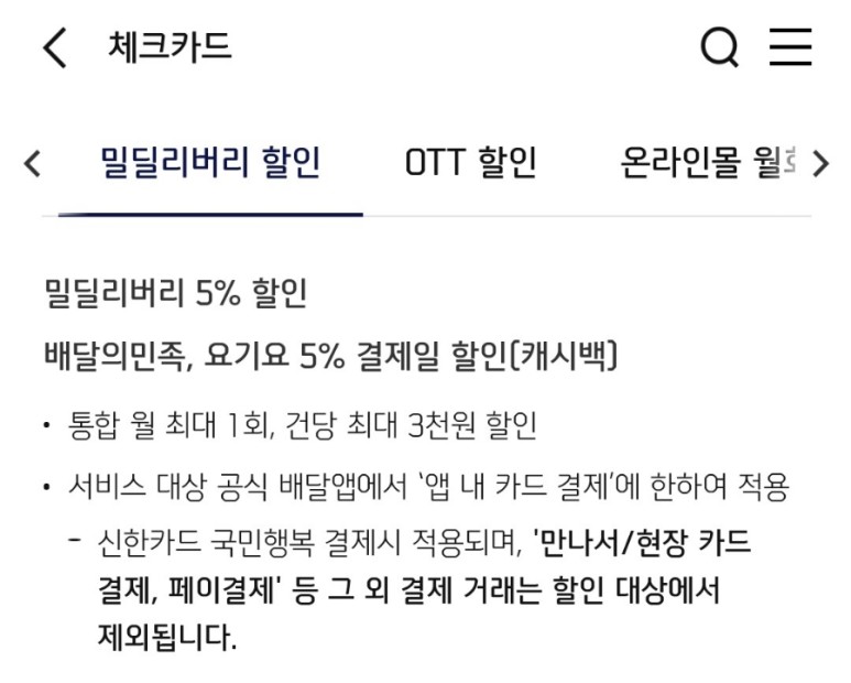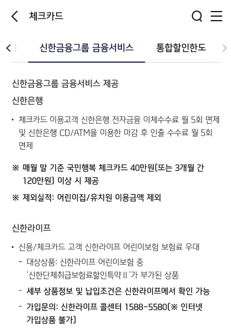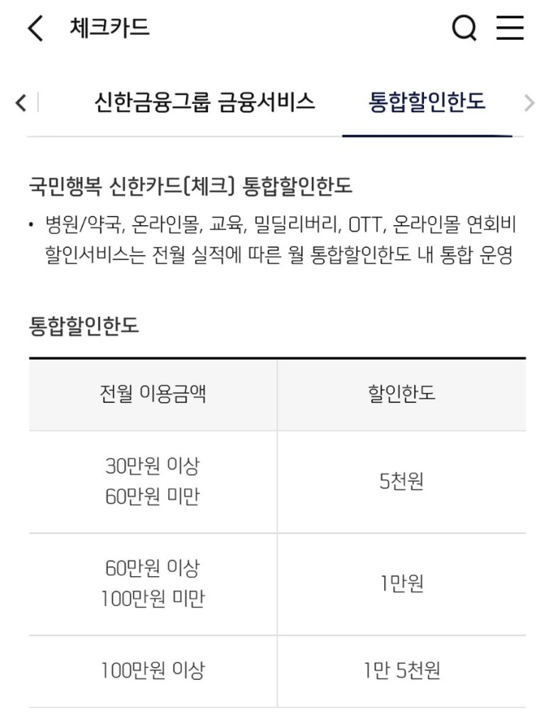 체크카드와 할인되는 항목은 같지만 할인율과 전체 할인한도가 다르다고 보면 된다.- 할인율 : 5%(체크)/10%(신용) – 할인한도 : 전월실적 ᅵᅮ 基準기준 합계(체크)/((신용) <신한카드 국민행복체크혜택>