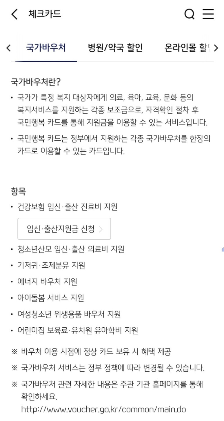 신한카드, 국민행복체크카드, 혜택, 임산부 바우처용으로 만든 카드라 큰 기대를 하지 않았지만 의외로 혜택이 많다.
