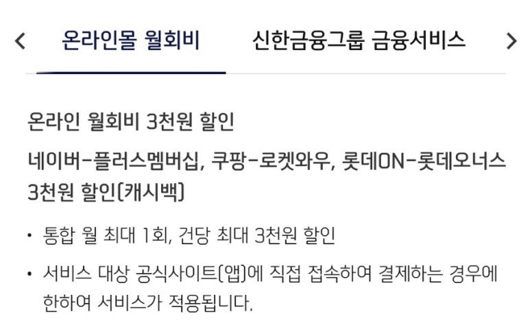 신한은행 이체 / 인출수수료가 5회 면제된다지만 가능하면 이체수수료가 무료여서 굳이 원하는 혜택은 아닌 것 같다.<이 카드의 단점, 통합 할인 한도>