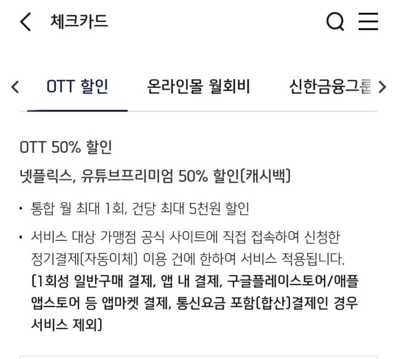 특히 넷플릭스 유튜브 할인! 내가 바라던 것이다.고정비용으로 다른 신한 체크카드를 사용 중이었는데 어차피 정기결제 되었던 것들은 모두 이 카드로 바꾸기로 했다!