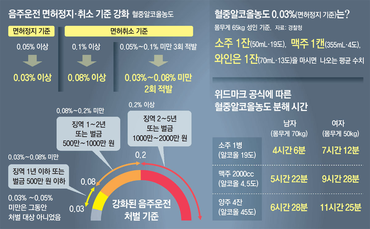 법령이 바뀌는 데는 여러 요인이 영향을 미친다고 했습니다. 술을 마시면 정상적인 사고를 유지하거나 신체 능력을 유지할 수 없다고 합니다. 보다 감정적으로 행동하기 쉽고 위험을 감지해도 반응 속도가 느려진다고 했습니다. 피할 수 있을 것 같은 교통사고를 피할 수 없게 되거나 사고의 결과가 더 나빠지는 원인이 된다고 했습니다. 사망사고의 원인으로도 꼽히기 때문에 음주운전을 예비살인자로 보는 시선까지 존재할 정도라고 했습니다. 따라서 2회 이상 적발되면 도로교통법에서는 단순 적발과는 별도의 규정을 두고 2년 이상 5년 이하의 징역형 또는 1,000만원 이상 2,000만원 이하의 벌금형을 선고하도록 규정한다고 했습니다.