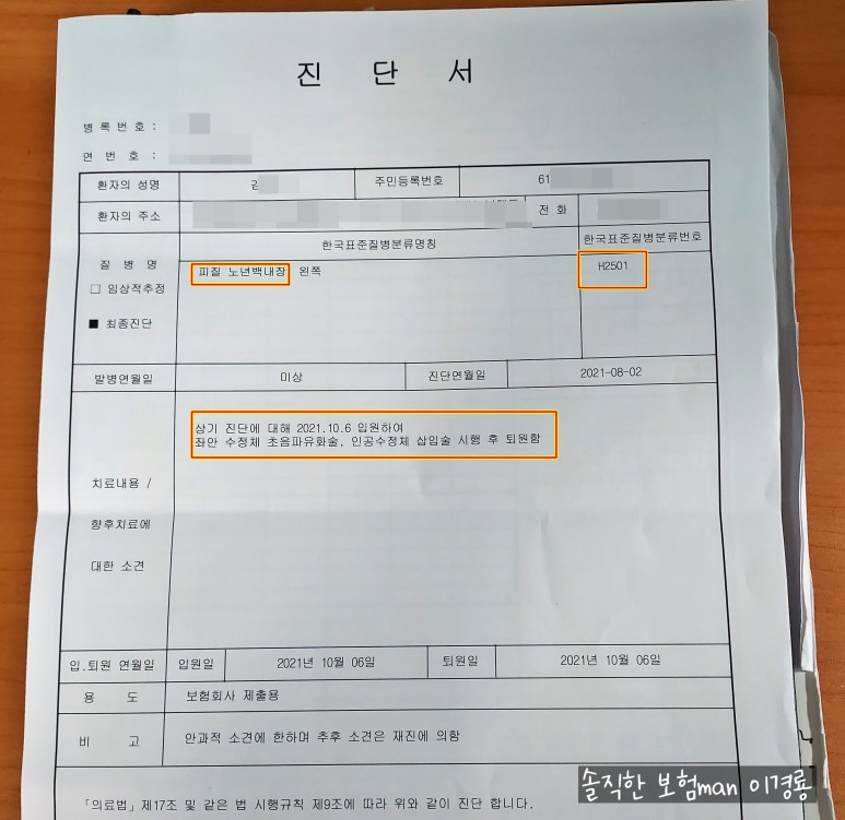 백내장 수술은 생체를 절단·절제하는 행위로 진행하기 때문에 관혈 수술로 보고 가입한 보험특약 중 #질병수술 #질병5종 수술에 해당하므로 의료실비와 모두 보상받을 수 있습니다~!