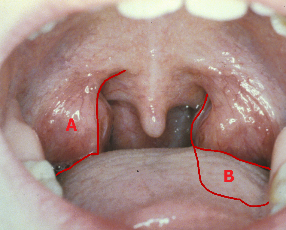 A는 편도선을 덮고 있는 근육인데 이렇게 생긴 근육이 편도선 앞에도 있고 뒤에도 있어요 이들 근육 사이의 공간인 편도선과 (tonsillar fossa)에 편도선이 있습니다. 위의 사진처럼 A근육이 편도선을 가리기 때문에 눈만으로 편도선을 관찰하는 데 한계가 있습니다.