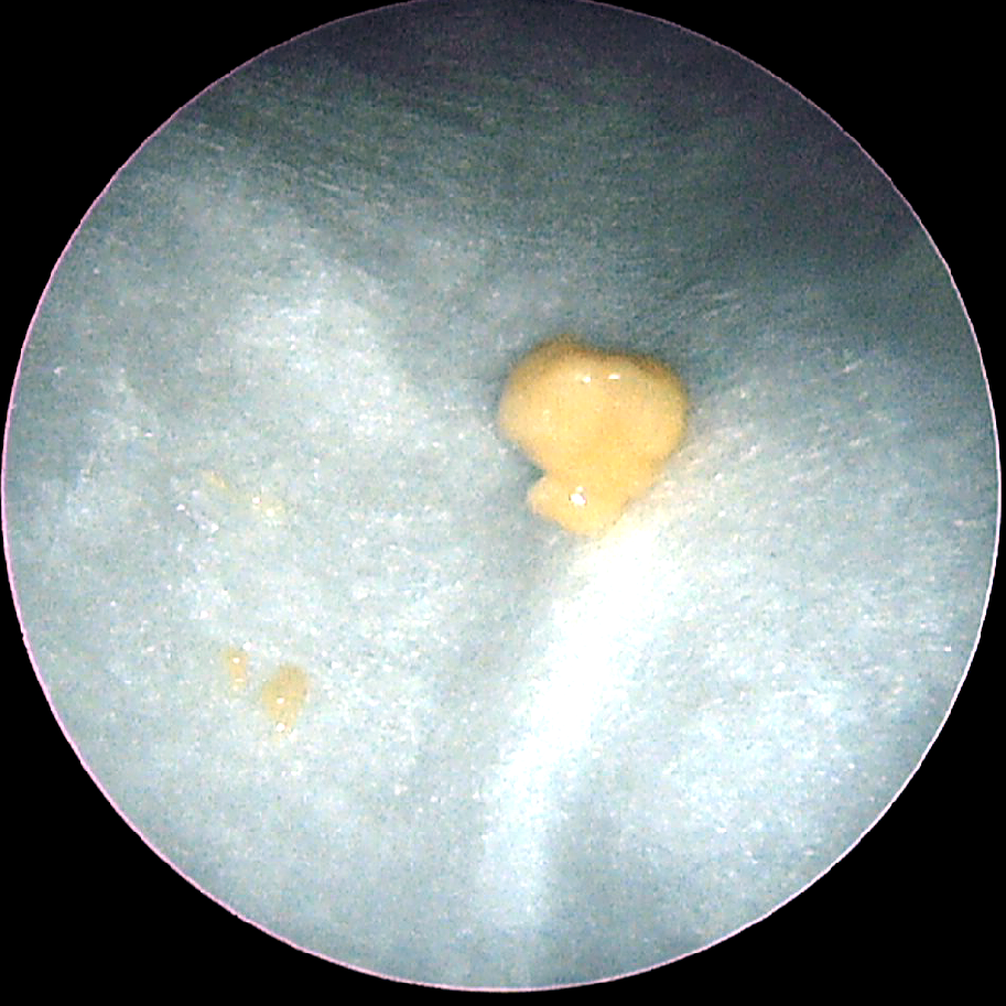 눈에 보이고 있던 것은 2 밀리미터 정도였지만, 실제로는 1 센티미터 가까운 결석이었습니다. 이름이 돌이지만, 실제로 돌처럼 딱딱한 경우는 드물고, 손으로 누르면 걸쭉하게 부서지는 치즈 같은 느낌입니다. 굳었을 때 엄청난 악취가 손에 묻기 때문에 깜짝 놀랄 정도입니다.