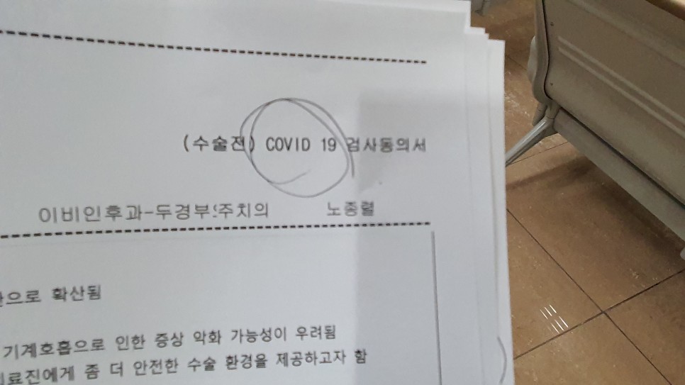 다음날 수술할 때는 보호자가 있어야 한대요. 전신 마취이기 때문에 간단한 수술이지만, 제가 하고 보호자 없이 하겠습니다. 요즘 코로나로 위험하지만