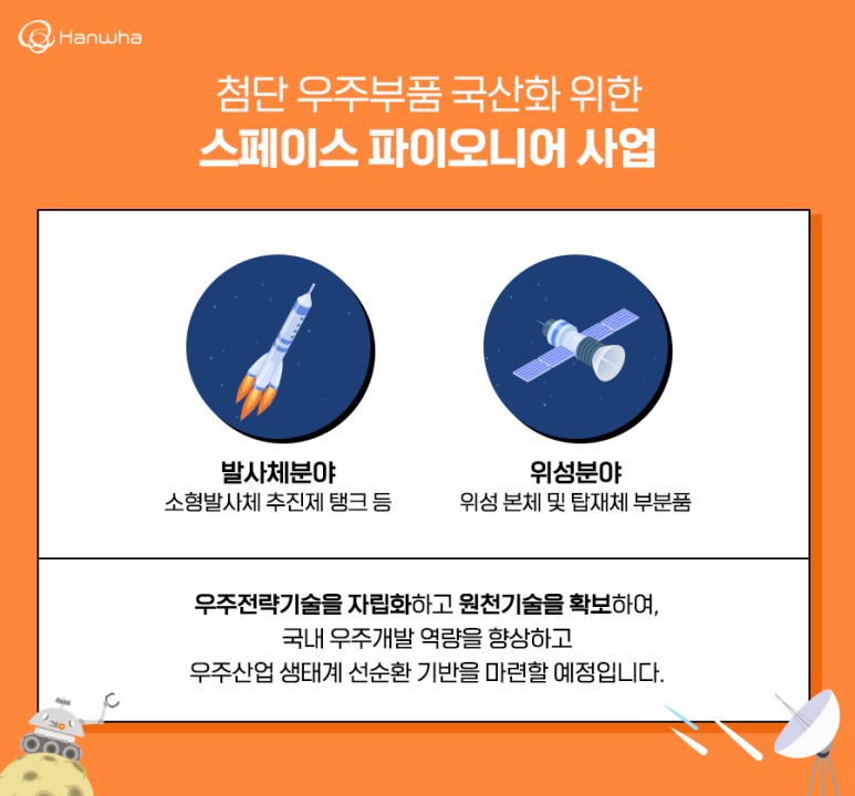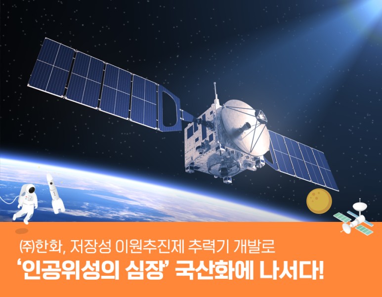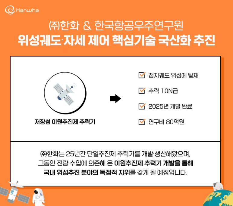 한화와 한국항공우주연구원은 2025년까지 정지궤도위성이 보다 오랜 기간 안정적으로 임무를 수행할 수 있도록 하는 저장성이원추진제 추력기를 함께 개발해 국산화한다고 밝혔다. 정지궤도 위성은 발사체에서 분리된 뒤 높은 임무 궤도까지 자체 추력으로 올라가야 하고 15년 이상 극한의 우주 환경에서 작동해야 하지만 그동안 정지궤도 위성에 적용된 이원추진제 추력기는 독일과 같은 해외 업체에 의존해 왔다.