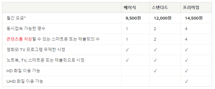 넷플릭스 요금제 좀 알아볼게요.베이직(1인 사용)의 경우 월 9500원 / 스탠다드(동시접속 2인) 13,500원 / 프리미엄(동시접속 4인)으로 이전보다 가격이 많이 오른 편입니다.또 예전에는 한 달 무료 체험 혹은 통신사와 결합하면 3.300원 할인 등이 있었지만 지금은 그런 조건조차 없기 때문에 LG인터넷TV와 함께 가입하는 것이 좋습니다.