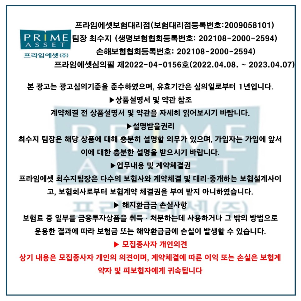 (상기 내용은 모집 종사자 개인의 의견이며, 계약 체결에 따른 이익 또는 손실은 보험계약자 및 피보험자에게 귀속합니다.)