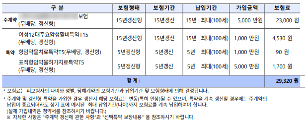 보험연령 27세 / 여성 / 상해급수 1급 / 15년 납부 ~ 15년 만기 갱신형 (일부 특약 5년 갱신형) (보험사별, 상품별, 연령, 직업, 성별에 따라 가입가능한 담보와 가입금액 및 보험료가 상이할 수 있습니다.)