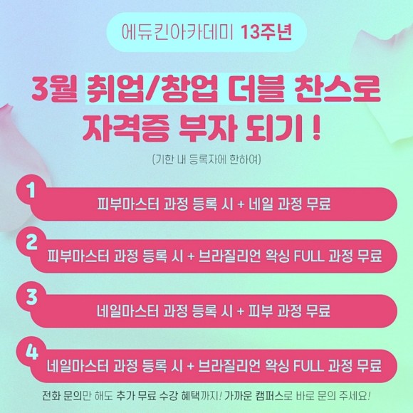 결과적으로 피부 마스터 과정을 등록했습니다!제가 학원 등록할 때도 행사를 하고 있어서 국비 지원을 받느니 차라리 합리적인 수강료로 등록한 것 같은데~ 지금도 또 행사가 있거든요!피부취업 마스터과정에 등록하시는 수강생들은 네일취업 마스터과정이나 왁싱 FULL과정을 무료로 등록해주시지만 저처럼 왁싱에도 관심이 있으신 분들은 지금이 아주 좋은 기회라고 생각할 정도로 파격적일 겁니다!