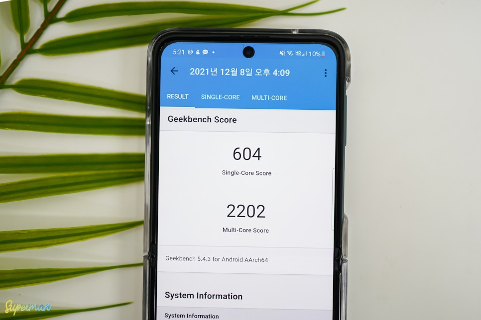 이어 긱벤치5입니다. 싱글코어 기준 604점, 멀티코어 기준 2202점으로 갤럭시S21(싱글코어 901점, 멀티코어 2963점) 약 26% 정도 낮아졌는데. 원래 멀티코어 기준 3천점이 넘어야 하는데, 반복된 로드링 현상으로 낮게 측정된 결과만 볼 수 있습니다.