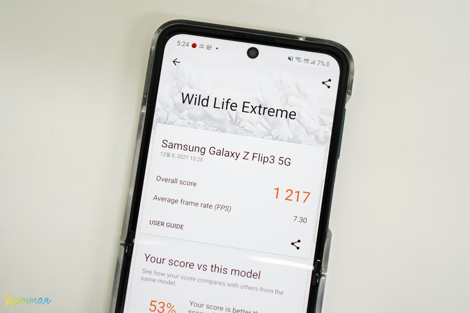 그래픽 성능을 체크할 수 있는 3dmark Wild Life Extreme 점수는 1217점으로 갤럭시S21(1420점)에 비해 약 15% 낮은 수준입니다.