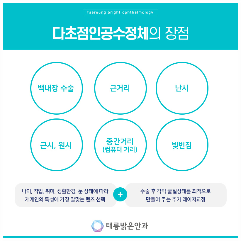 많은 인공수정체가 있지만 그 중에서도 저에게 잘 맞는 인공수정체를 선택하는 것은 매우 중요합니다. 정밀검사와 의료진의 진료 후 인공수정체를 선택하게 되는데, 여기서 가장 중요한 것은 생활습관에 따른 인공수정체를 선택하는 것입니다. 인공수정체는 크고 먼 거리가 잘 보이는 단초점, 먼 거리, 중간 거리가 잘 보이는 연속초점, 먼 거리, 중간 거리, 가까운 거리가 잘 보이는 3중 초점으로 나뉩니다.이처럼 다양한 인공수정체 중 개인의 눈 상태는 물론 나이, 직업, 취미, 생활습관 등을 고려하여 노원백내장 수술을 시행할 때 자신에게 맞는 맞춤형 인공수정체를 착용해야만 수술 후 높은 만족도를 얻을 수 있습니다.