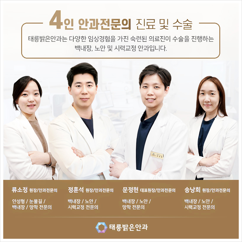 자세한 상담 및 예약은 언제든지 태릉밝은안과 홈페이지로 전화 상담 가능합니다.노원 백내장 수술은 역시 4명의 안과 전문의와 대학병원급 장비를 보유한 태릉밝은안과에서 해야 합니다.