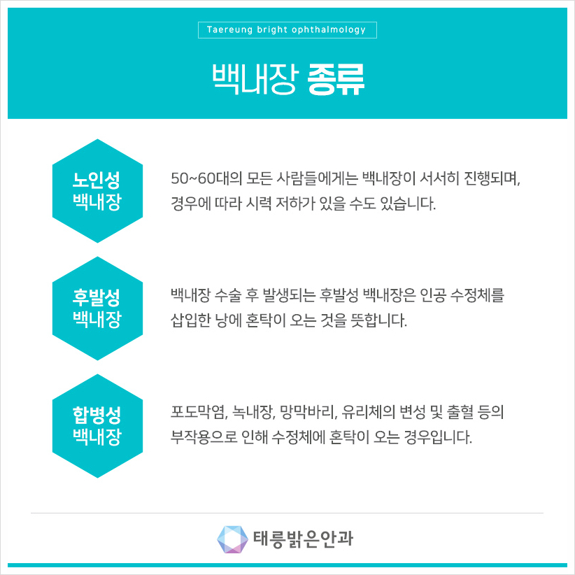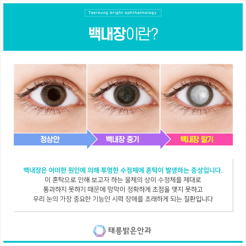 노원 백내장 수술을 하려면 먼저 백내장부터 잘 알아야 합니다. 백내장은 수정체가 노화로 인해 혼탁해지는 안질환입니다. 노안과 초기 증상이 비슷하여 구분하기 어렵기 때문에 나이가 들면 정기 검진을 통해 안구의 상태를 파악하는 것이 좋습니다.백내장은 방치하면 실명까지 이어질 수 있으므로 초기에 이상이 나타났을 때는 태릉밝은안과를 방문하여 확인해야 합니다.