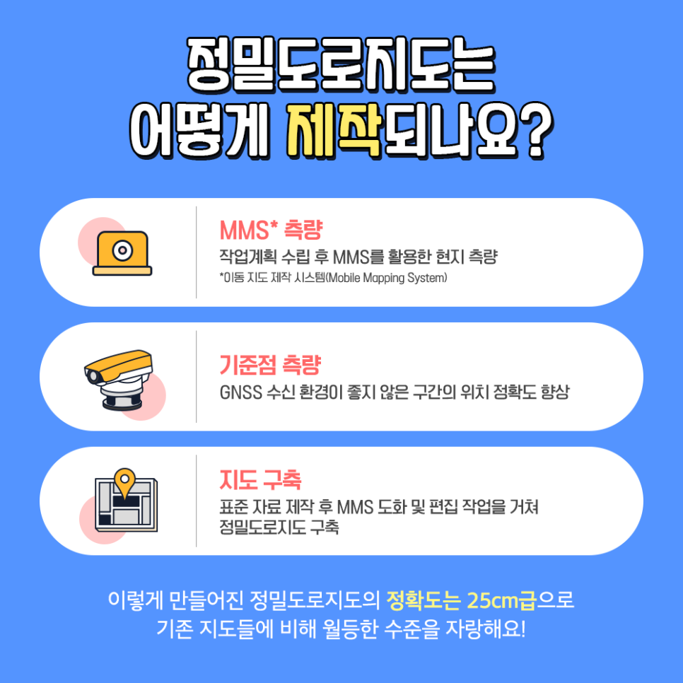 - 3. 지도구축 : 표준자료 제작 후 MMS도화 및 편집작업을 거쳐 정밀도지도 구축