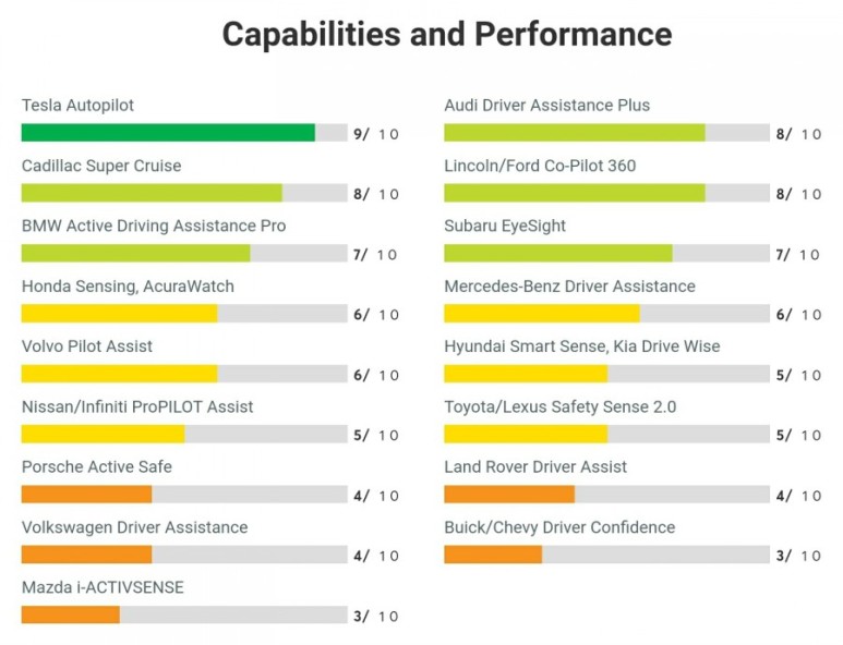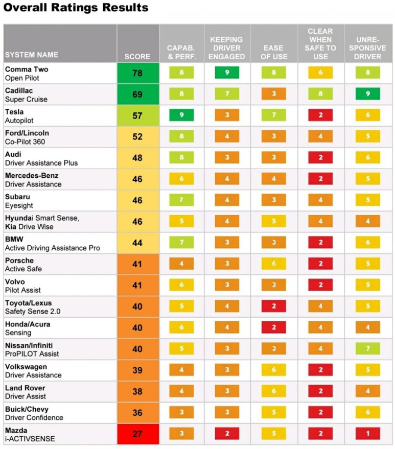 가장 중요한 종합 성능은 테슬라의 오토 파일럿이 가장 높고 Comma.ai의 오픈 파일럿, 아우디, 캐딜락, 링컨/포드가 그 뒤를 따르고 있습니다.