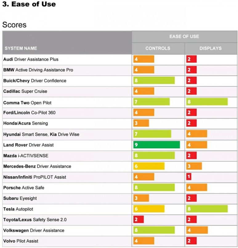 당연히 이를 지원하는 캐딜락 수퍼크루즈와 Comma.ai의 오픈 파일럿인 “Driver monitoring” 점수가 가장 좋습니다.