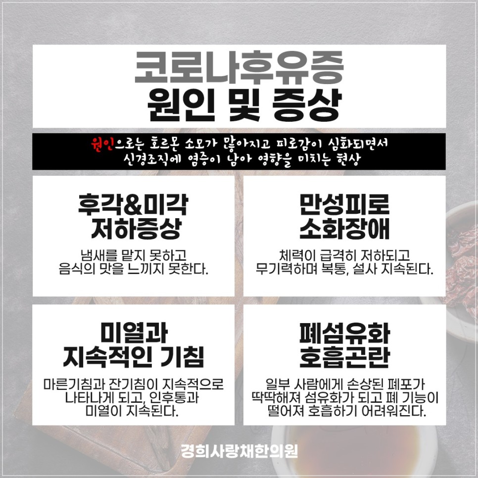호흡기 질환의 후유증의 경우 후각·미각 저하 증상, 만성 피로 소화 장애, 미열과 지속적인 기침, 폐섬유화 호흡 곤란 등 다양한 질환을 동시에 일으킬 수 있습니다.