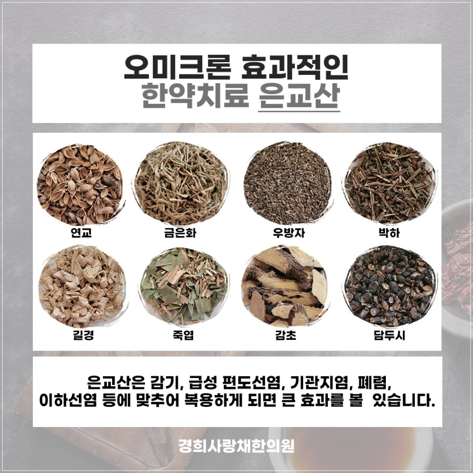 한의원에서는 해당상태에서 정말 많이 쓰이는 처방이 ‘은교산’입니다. 주로 열이 나는 증상에 사용되는 한약으로 오랫동안 바이러스 유행병에 사용된 처방이기도 합니다. 특히 발열시간을 단축시키는 효과를 기대할 수 있으며,