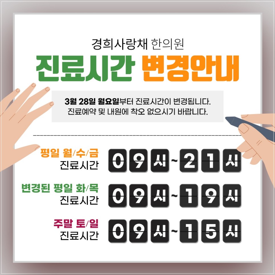 주중 월/수/금은 오전 9시부터 오후 9시까지 진료하며, 평일 화/목은 오전 9시부터 오후 7시, 주말은 오전 9시부터 오후 3시까지 진료합니다.