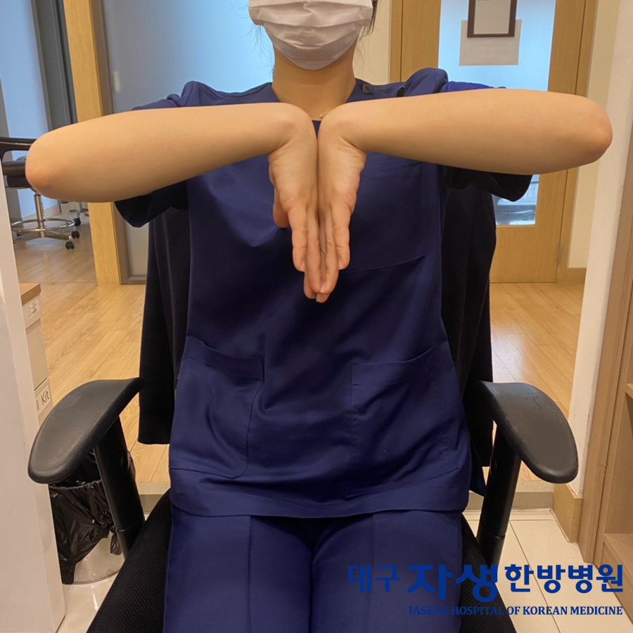 가슴 앞에 손등을 대고 일직선상에 위치하도록 합니다.이 자세를 30초 이상 유지해주세요이 때 저리거나 통증이 생기거나 하면 손목 터널 증후군이 의심됩니다.