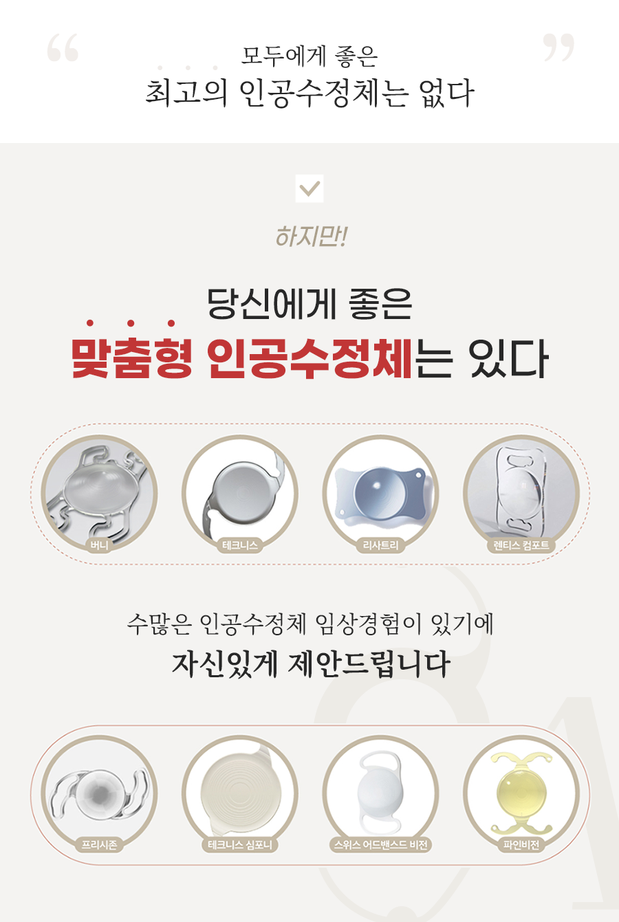 압구정안과의원은 바니, 테크니스, 리사토리, 렌티스 컴포트, 프리시즌, 테크니스심포니, 스위스 어드밴스드 비전, 파인 비전 등 다양한 다초점 인공수정체를 보유하고 있습니다. 레이저 백내장 수술 시 선택되는 렌즈는 안구 상태, 백내장의 진행 정도, 나이, 직업, 라이프스타일 등을 모두 고려하여 가장 적합한 것으로 안내합니다.