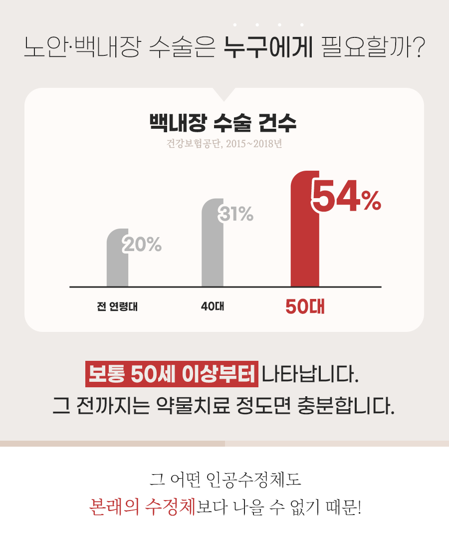 초기에는 약물치료가 가능하지만 이 방법만으로는 탁해진 수정체가 다시 맑아지지 않기 때문에 궁극적으로는 수술을 하는 것이 좋습니다. 레이저 백 내장 수술은 수기 방식의 단점을 보완한 방법으로 사람의 손과 눈이 아닌 자동화 기술의 Z8 시스템을 기반으로 이루어집니다. 레이저를 이용할수록 기존 방법보다 정확도, 성공률, 치료 후 시력회복 등의 부분에서 우월하다는 장점이 있습니다. 특히 정교하게 절개하여 위치와 각도, 패턴 등 눈의 상태에 따라 제공되기 때문에 합병증의 발생 위험이 적습니다.
